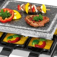 مشخصات کالا : * نوع گریل : برقی* دستگاه گریل راکلت پز دو منظوره * دارای صفحه سنگی داغ و یک صفحه فلزی دو رویه * مناسب برای گریل کردن و طبخ مواد * مجهز به یک صفحه آهنی دو رویه [ قسمت نرم : برای طبخ ماهی و … – قسمت شیاردار : برای طبخ گوشت و … ]* استفاده از سنگ طبیعی برای گریل ( با هدف گریل کردن به صورت کم چربی و سالم )* ابعاد کلی ناحیه گریل : 24 × 48.5 سانتی متر ( ( 24 × 24 ) × 2 سانتی متر )* دارای 10 تابه کوچک – 10 کفگیر چوبی کوچک * دارای دستگیره ای از جنس استیل ضدزنگ با پوشش عایق* مجهز به ترموستات با قابلیت تنظیم مداوم درجه حرارت * دارای چراغ نشانگر ( نمایش با رنگ آبی رنگ )* جنس صفحه گریل و تابه های کوچک : پوشش نچسب با قابلیت شست و شوی آسان* توان دستگاه : 1700 وات* 220–240 ولت, 50/60 هرتز, 1700 وات